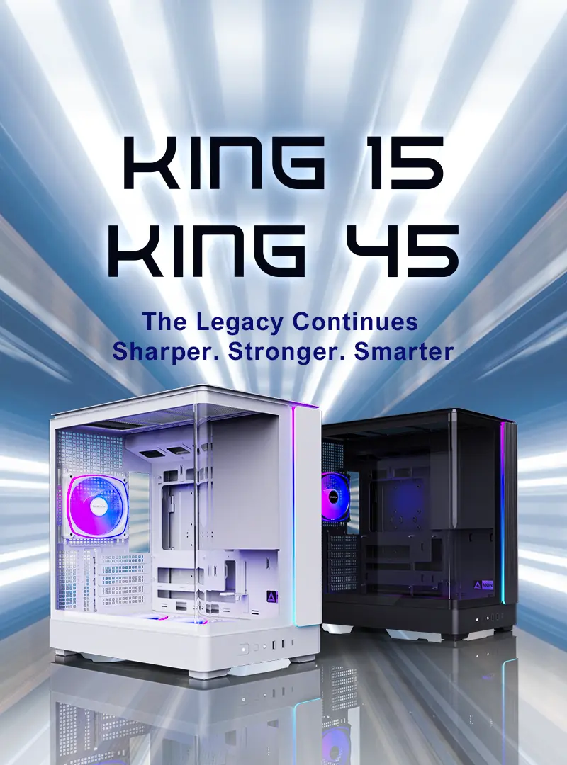 By 2023, we redefined PC design with the KING series, featuring the world’s first curved glass PC case, a rotatable fan bracket, and groundbreaking features that set new industry standards.